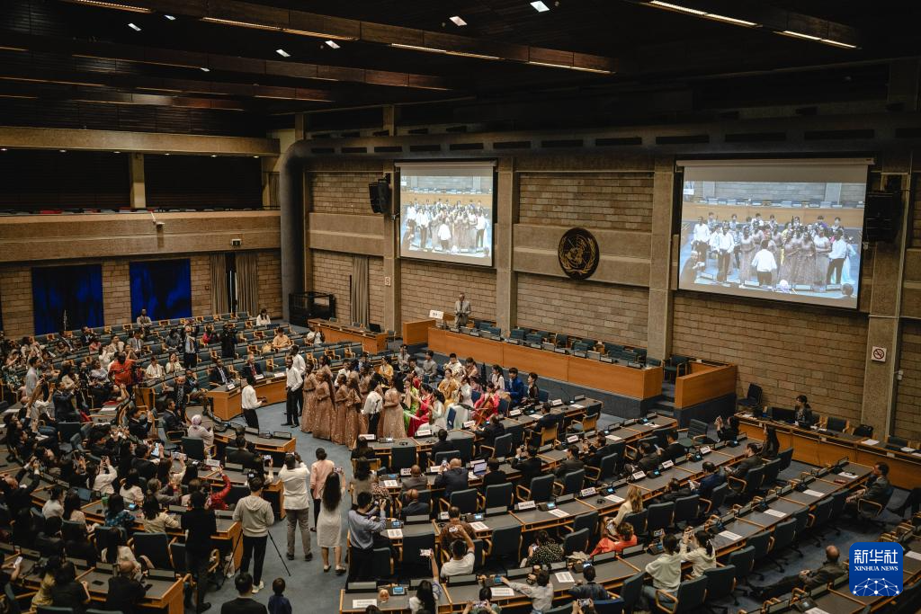 4月19日,在位于肯尼亚内罗毕的联合国环境规划署总部,南京大学民乐团与当地合唱团在中文日庆祝活动现场进行中国民乐表演。
