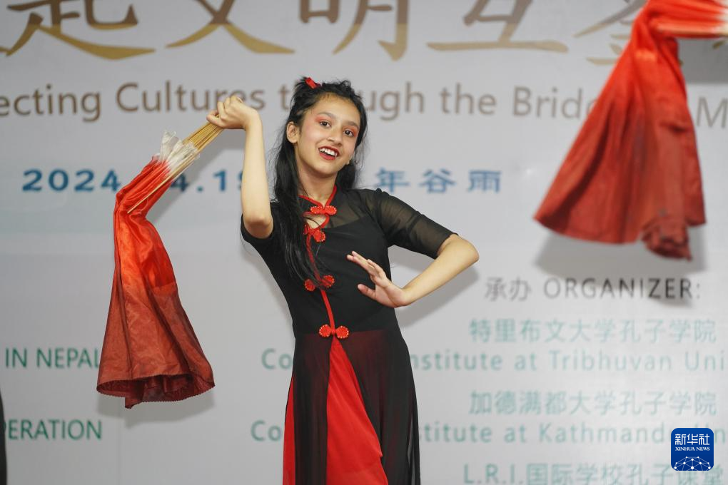 4月19日,在尼泊尔首都加德满都举行的庆祝中文日庆祝活动上,孔子课堂学员表演中国舞蹈。