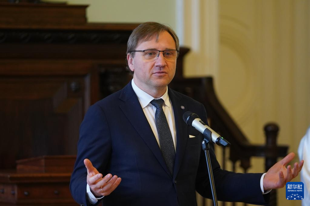 4月19日,在拉脱维亚首都里加举行的中文日活动暨汉语教材《盼达汉语》新书发布会上,拉脱维亚大学校长贡达尔斯·贝尔津什致辞。
