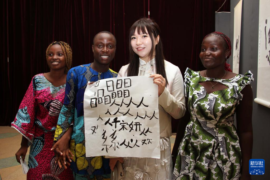 4月19日,在贝宁科托努的贝宁中国文化中心,人们在“画意的书法”作品展上学习书法。
