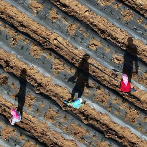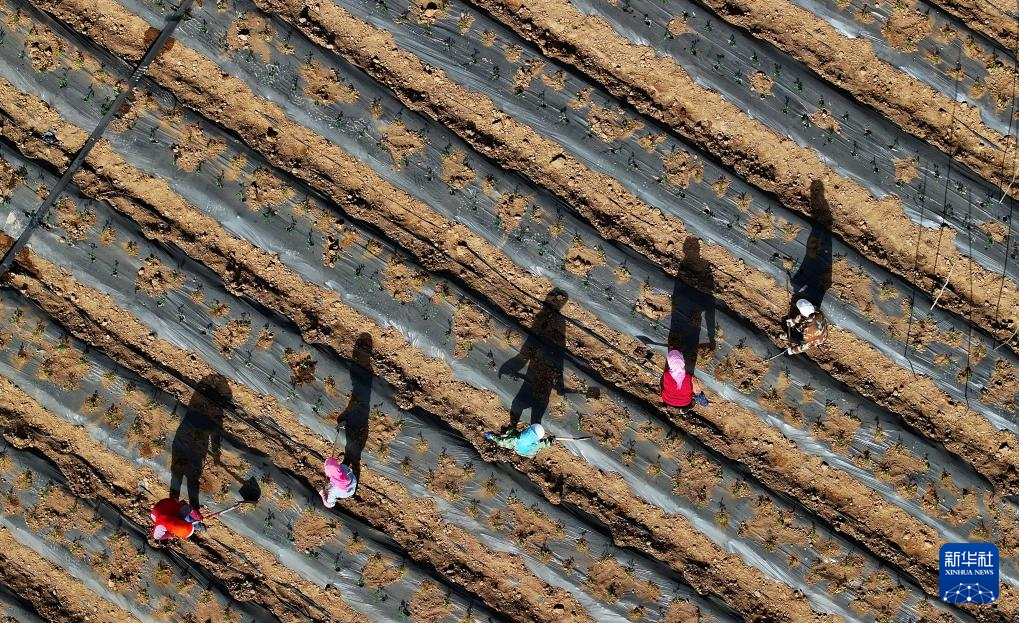 4月16日,在宁夏银川市贺兰县常信乡,农户在田间种植小番茄(无人机照片)。