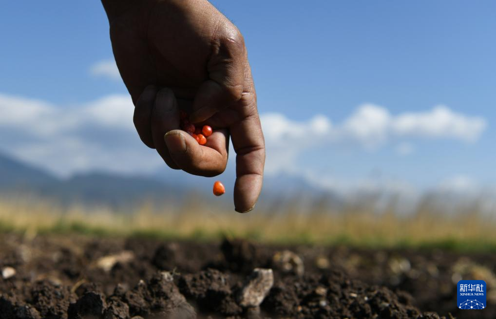 4月18日,在云南省丽江市玉龙纳西族自治县,农民在农田里播种玉米。