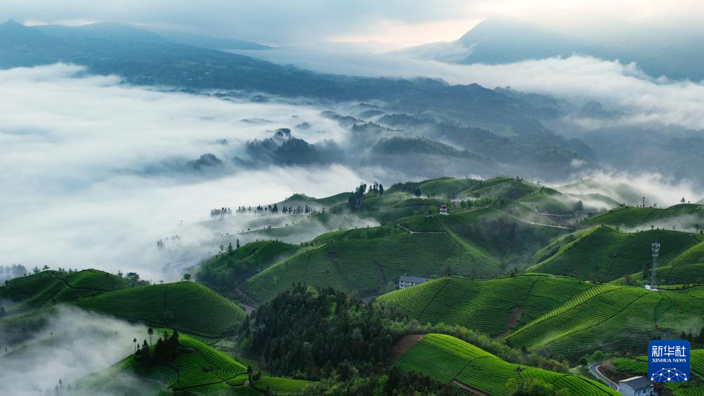 4月18日拍摄的湖北省恩施土家族苗族自治州鹤峰县走马镇木耳山观光茶园(无人机照片)。