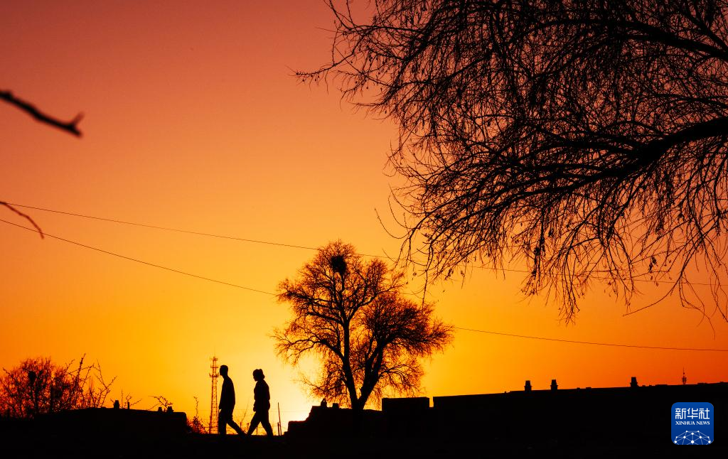 4月10日傍晚,在甘肃省武威市古浪县土门镇,治沙人郭玺(左)和妻子晚饭后散步。