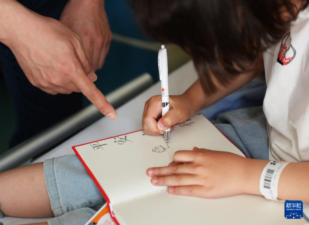 4月12日,在山东第一医科大学附属中心医院,一名来自新疆的先心病儿童用收到的文具作画。近日,19名来自新疆的先心病儿童在山东第一医科大学附属中心医院接受免费手术治疗。这些孩子的救治得益于中国红十字基金会“天使之旅”先心病儿童筛查救助爱心公益行动。