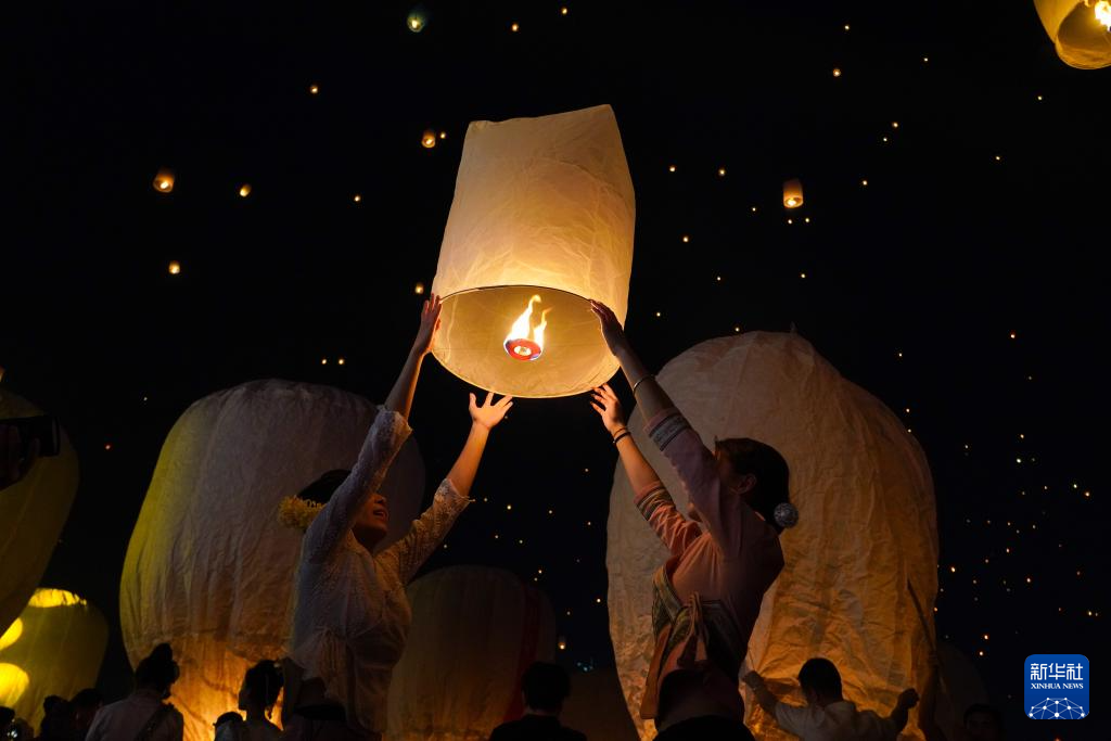 4月13日晚,人们在云南省景洪市澜沧江边放飞孔明灯,庆祝泼水节。