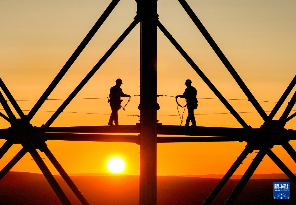 4月17日,工人在张北—胜利1000千伏特高压输电交流项目工程内蒙古段进行组塔作业(无人机照片)。