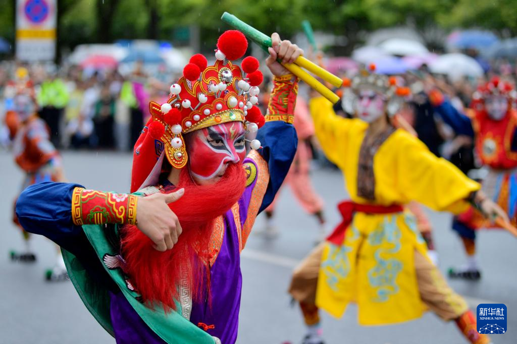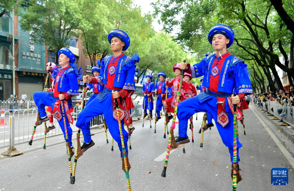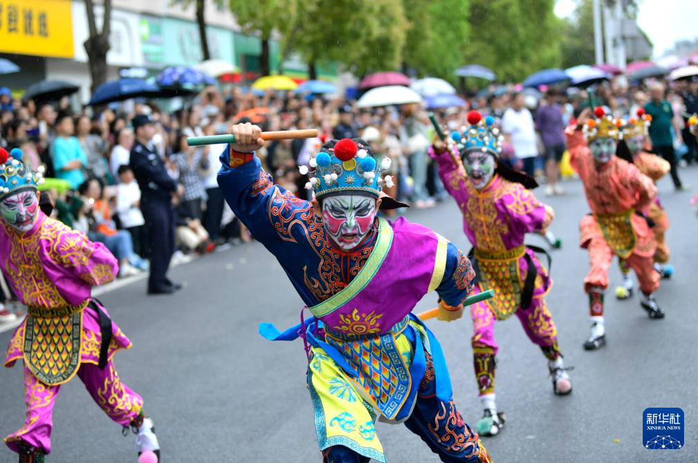 当日,湖北省恩施土家族苗族自治州来凤县举行非遗巡游活动,吸引来自广东、贵州、湖南等地的非遗爱好者参与。