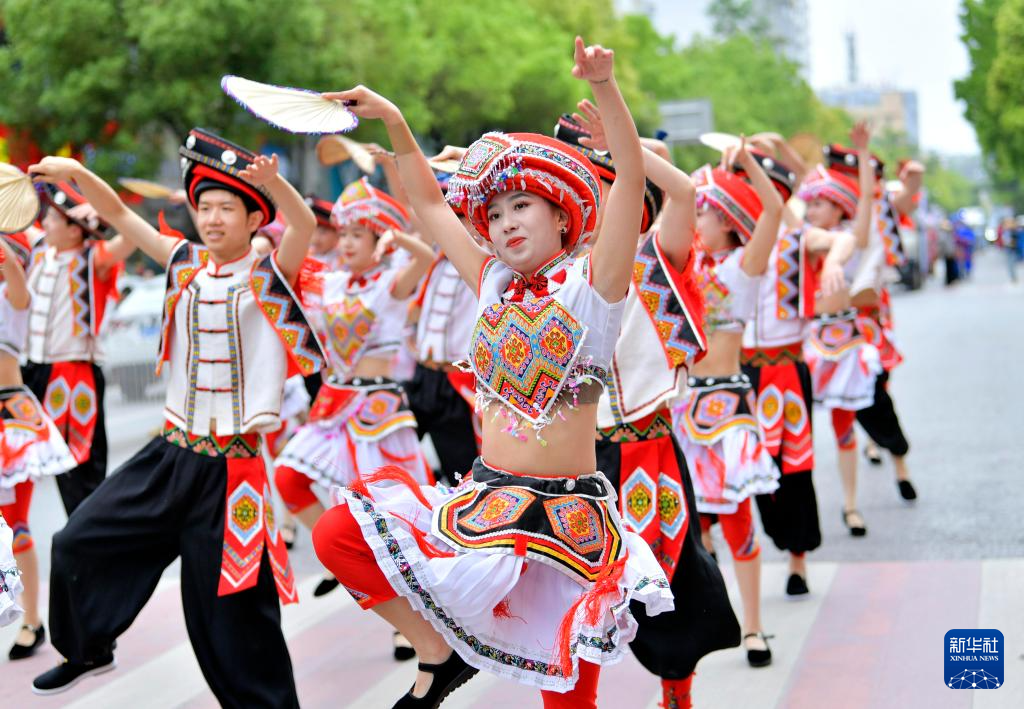 4月20日,在湖北省来凤县城区街头,来自贵州的民间艺人在表演苗族板凳舞。