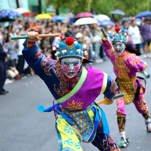 4月20日,在湖北省来凤县城区街头,来自广东的民间艺人在表演英歌舞。