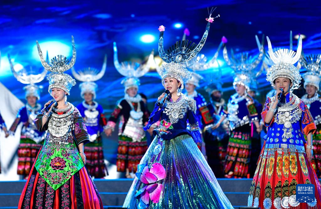 4月20日晚,演员在2024年贵州台江苗族姊妹节开幕式上演唱歌曲。