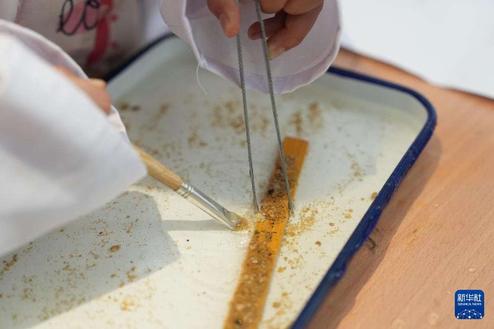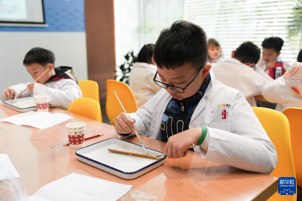 3月16日,孩子们在长沙简牍博物馆参与社会教育活动“探秘简牍的清洗与保护”。 新华社记者 薛宇舸 摄