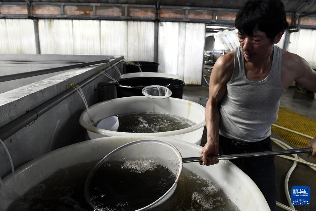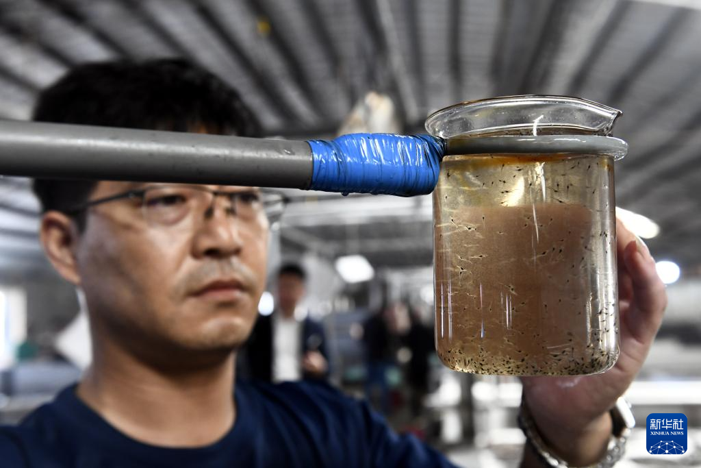 4月20日,在滨州市沾化区滨海镇渤海水产大北育苗场,养殖工人在观察虾苗质量。