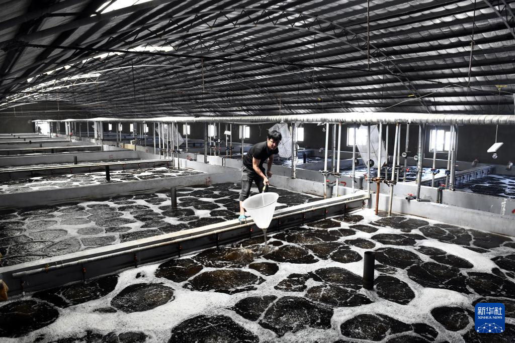 4月20日,在滨州市沾化区滨海镇渤海水产大北育苗场,养殖工人在培育虾苗。