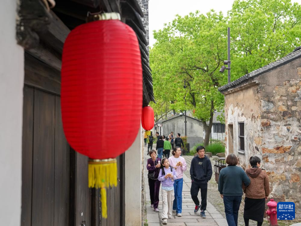 4月21日,小游客在常州焦溪古镇休闲游玩。
