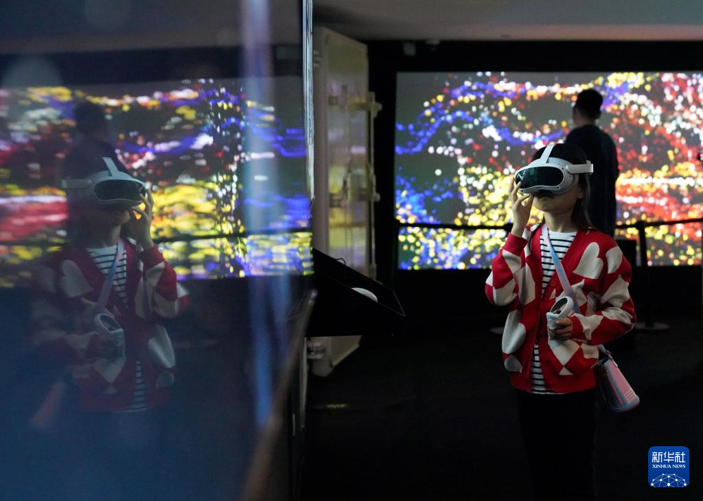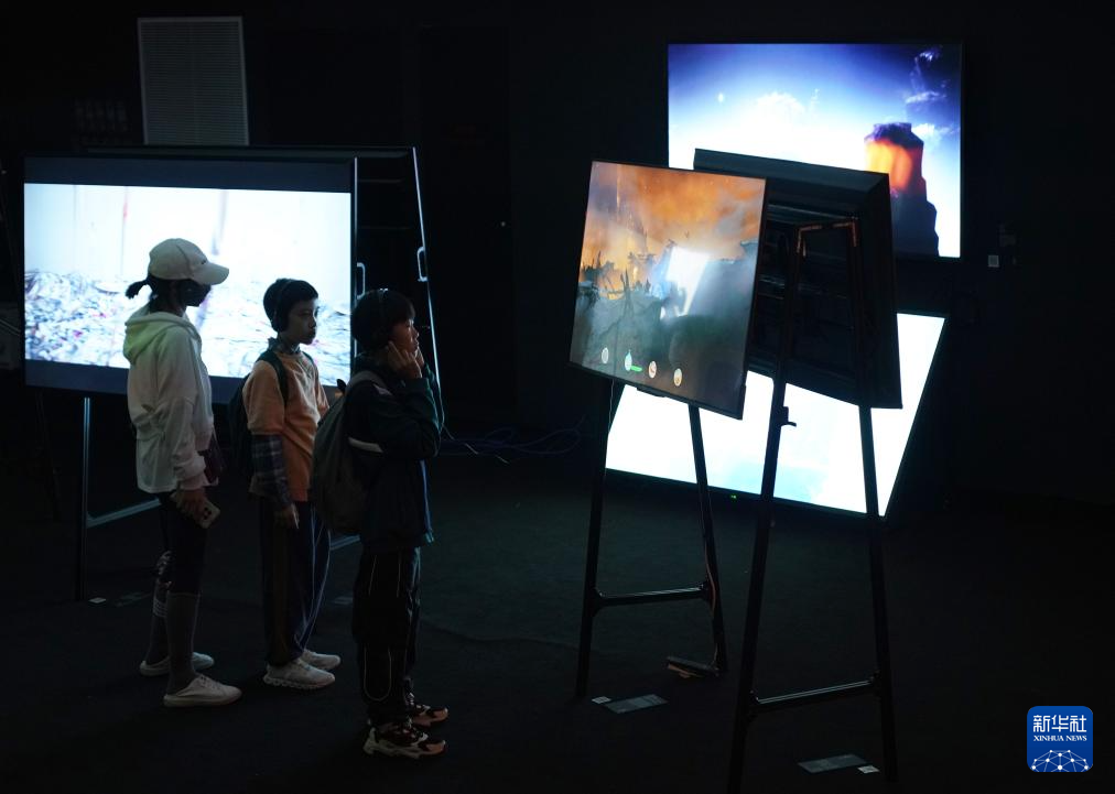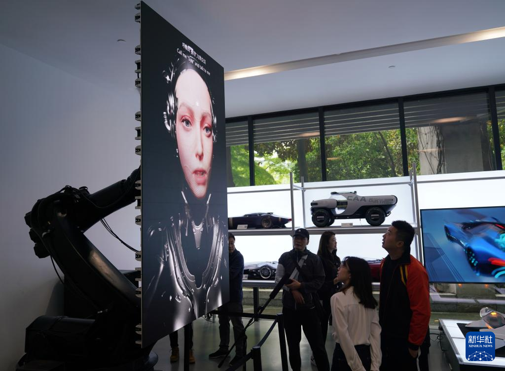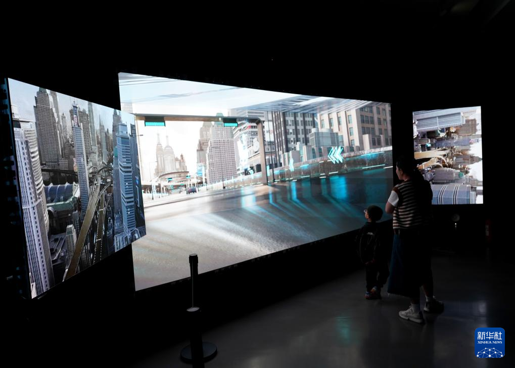 4月21日,观众在首届中国数字艺术大展上观看混合现实作品《未来出行仓》。