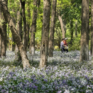 4月21日,市民在二月兰盛开的朝阳区京城森林公园游玩。