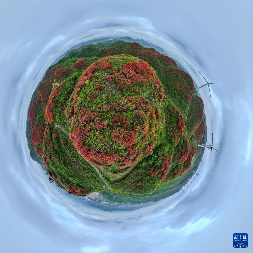 4月21日在贵州省遵义市播州区洪关苗族乡太阳坪景区拍摄的漫山遍野的杜鹃花(无人机全景照片)。