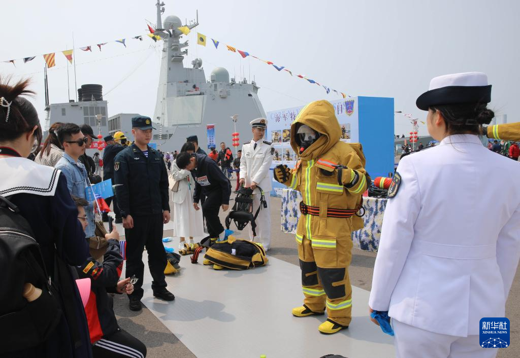 4月21日,青岛港3号码头,观众在参加防火服穿戴体验活动。