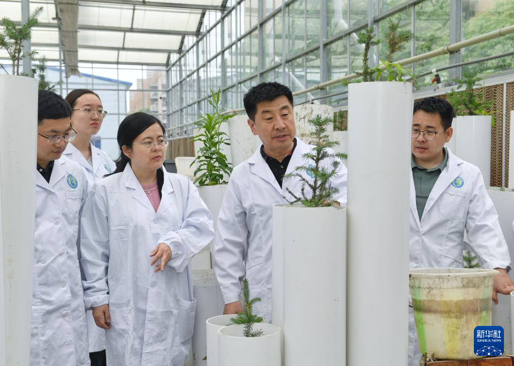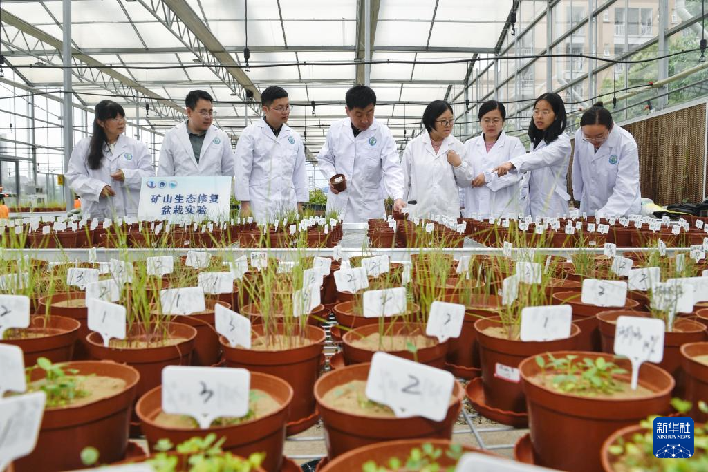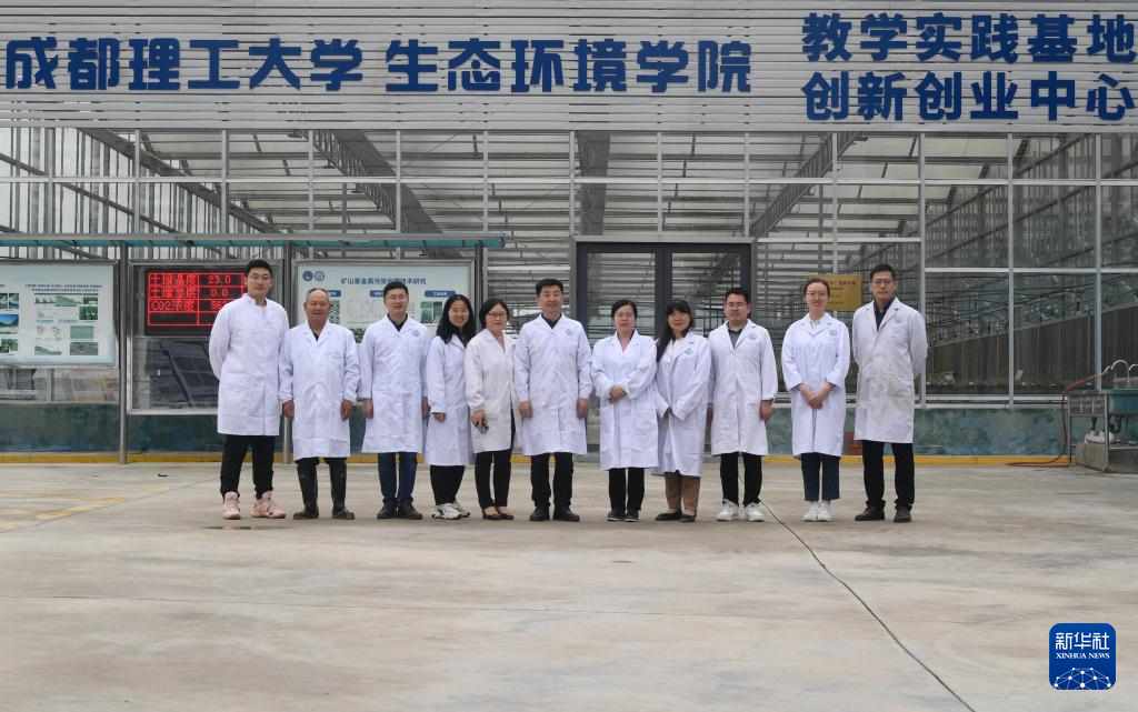 4月20日,在成都理工大学生态环境学院教学实践基地内,裴向军(左四)及团队成员在讨论矿山生态修复盆栽实验。