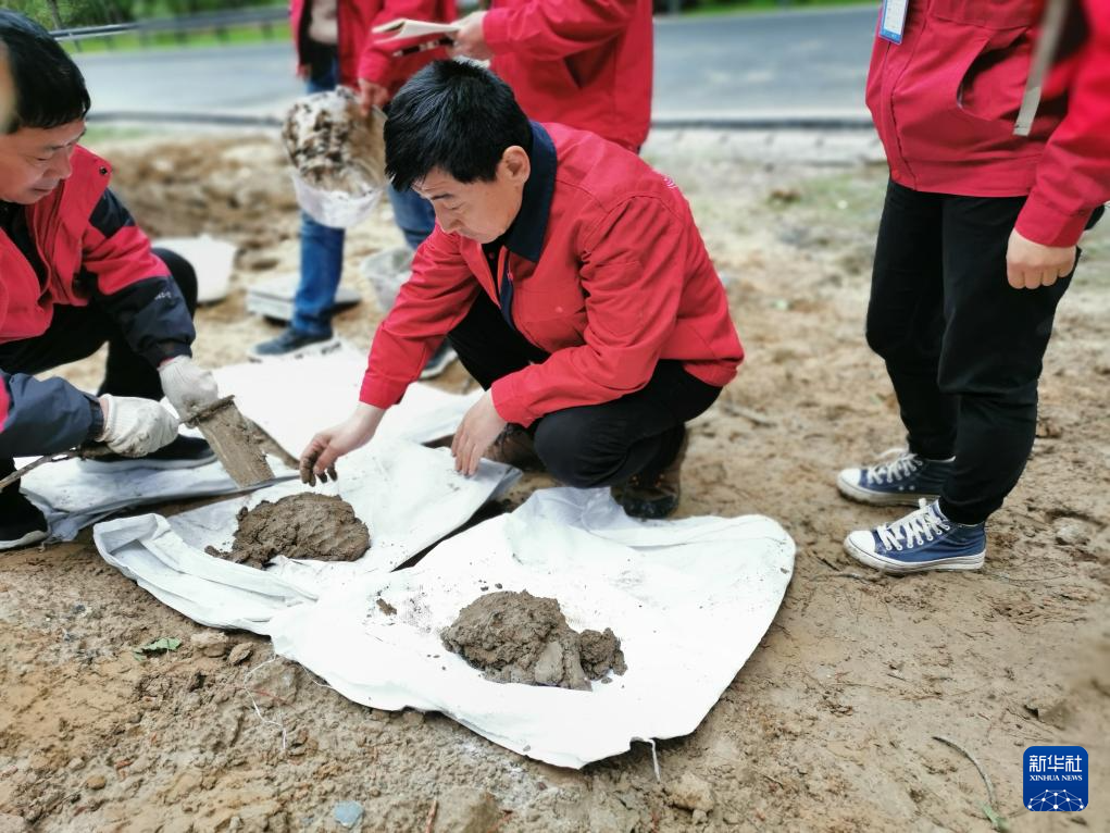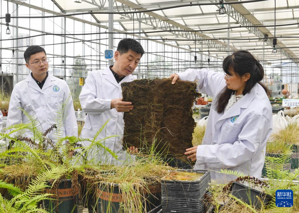 4月20日,在成都理工大学生态环境学院教学实践基地内,裴向军(中)及团队成员在展示其利用退化草皮培育的植生块。