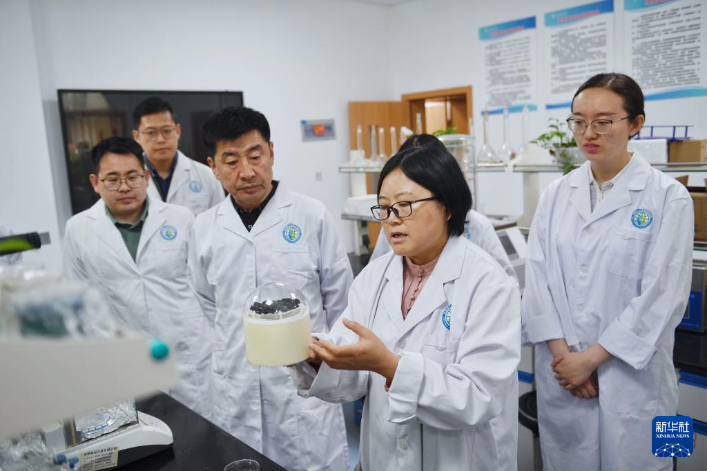 4月20日,在成都理工大学“四川省地质环境脆弱区生态修复材料与技术工程研究中心”内,裴向军(左三)及团队成员在展示其研发的光热驱动空气集水材料及应用模型。