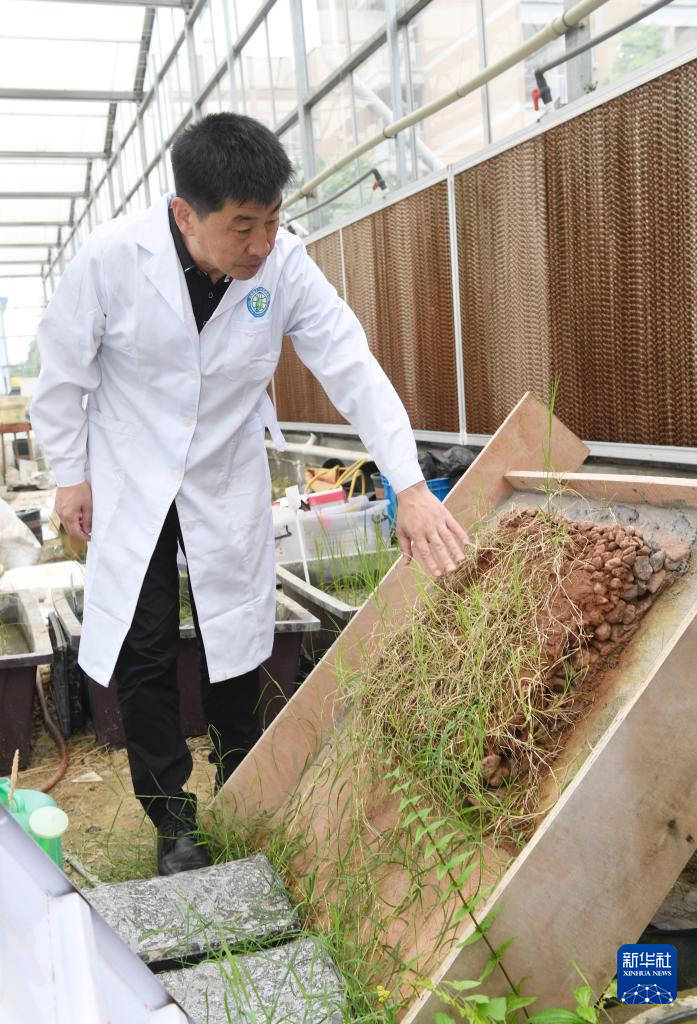 4月20日,在成都理工大学生态环境学院教学实践基地内,裴向军在介绍其团队培育的防冲防淹轻质植生块。