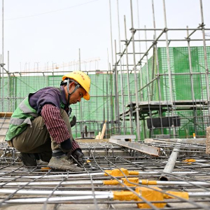 4月22日,中铁十二局工人在河北雄安新区大河片区安置房及配套设施项目建设现场捆绑钢筋。