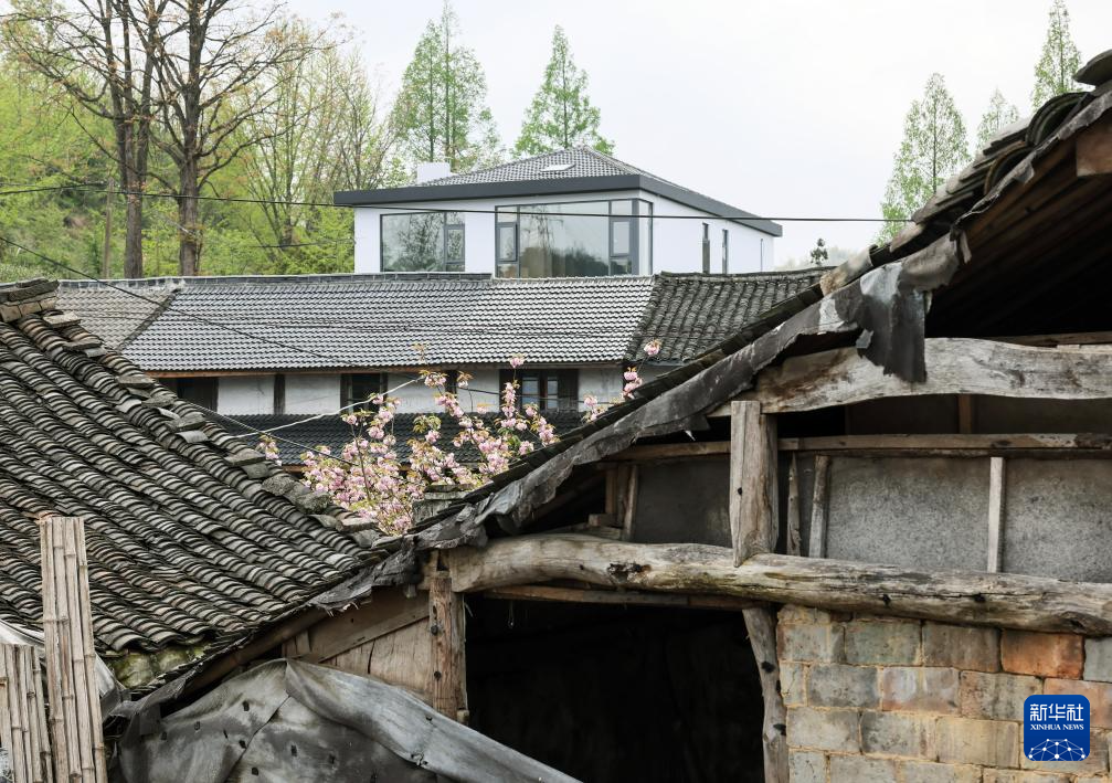 4月13日在浙江省余姚市鹿亭乡白鹿村拍摄的一户村民的新旧住宅。旧住宅目前被用做鸡舍,后面两排是新住宅。