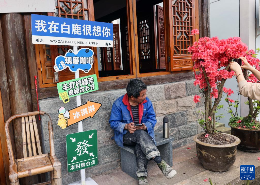 4月13日,一名村民在浙江省余姚市鹿亭乡白鹿村一家民宿前休息。