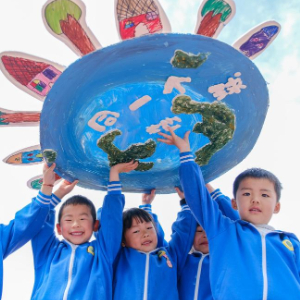 4月22日,浙江省湖州市长兴县水口乡中心幼儿园小朋友用手托起他们绘制的心目中的“美丽地球”。