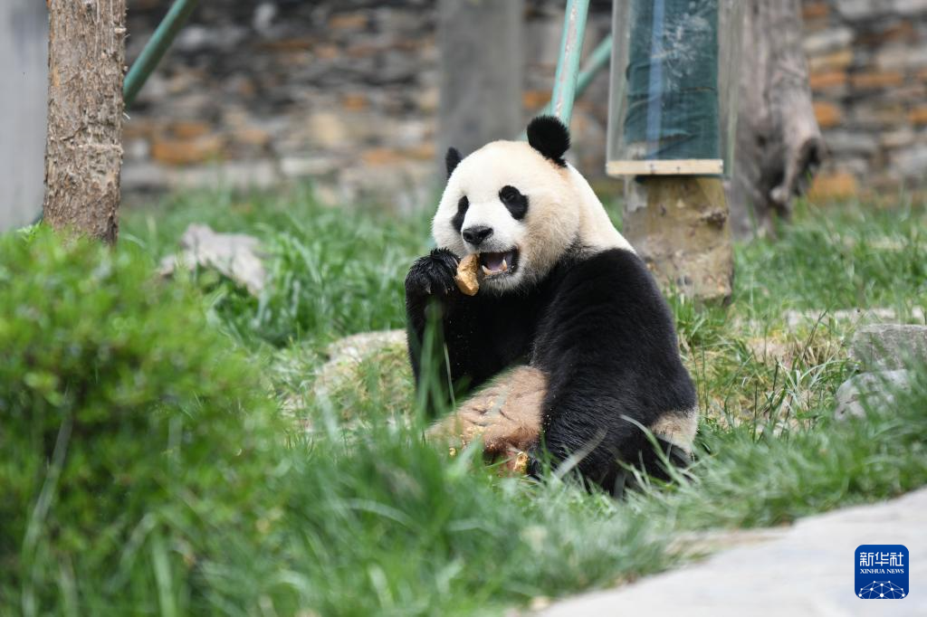 4月16日,在中国大熊猫保护研究中心神树坪基地,大熊猫“小奇迹”在吃窝窝头。大熊猫“小奇迹”,雄性,2020年8月21日出生于美国华盛顿国家动物园,目前在中国大熊猫保护研究中心卧龙神树坪基地。