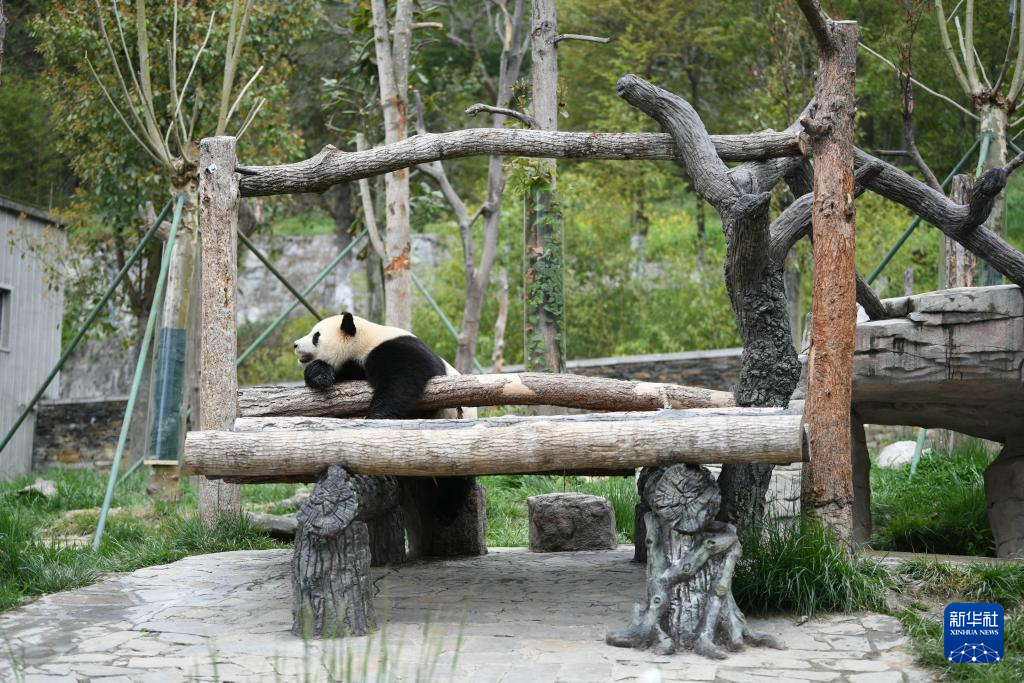 4月19日,在中国大熊猫保护研究中心都江堰基地,大熊猫“叻叻”在树上休息。大熊猫“叻叻”,雄性,2021年8月14日出生于新加坡河川生态园,目前在中国大熊猫保护研究中心都江堰基地。