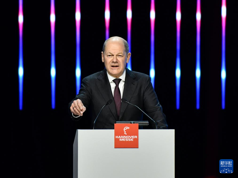 4月21日,德国总理朔尔茨在德国汉诺威工业博览会开幕式上致辞。