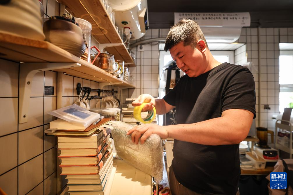 4月23日,潘新泽在门洞里书店为网购的读者打包书籍准备邮寄。