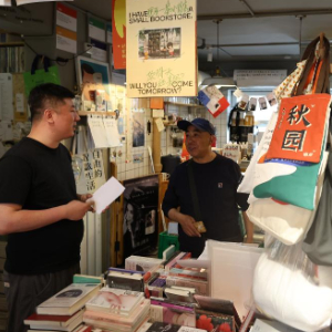 4月23日,潘新泽(左)在门洞里书店与购书的读者交流。