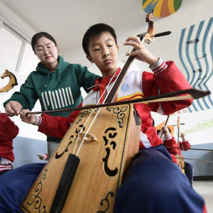 4月23日,在围场县第一小学,学生在老师指导下练习马头琴。