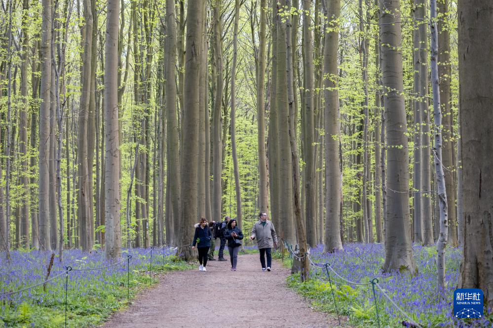 4月23日,游人在比利时布鲁塞尔附近的哈勒森林欣赏蓝铃花。