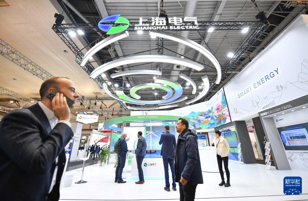 4月23日,在德国汉诺威工博会上,人们经过上海电气展区。