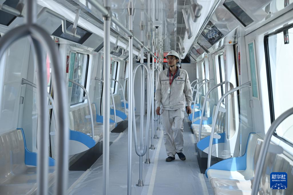 4月24日,工作人员在合肥轨道交通8号线一期首列电客车车厢内查看。