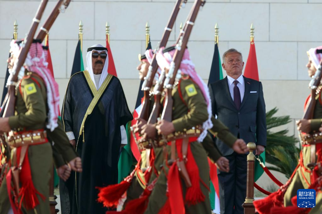 4月23日,在约旦首都安曼,约旦国王阿卜杜拉二世(前右)欢迎到访的科威特埃米尔米沙勒(前左)。