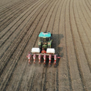 4月23日,工人操作机械在黑龙江北大荒农业股份有限公司友谊分公司采用等高环播方式耕种的一处玉米地作业(无人机照片)。