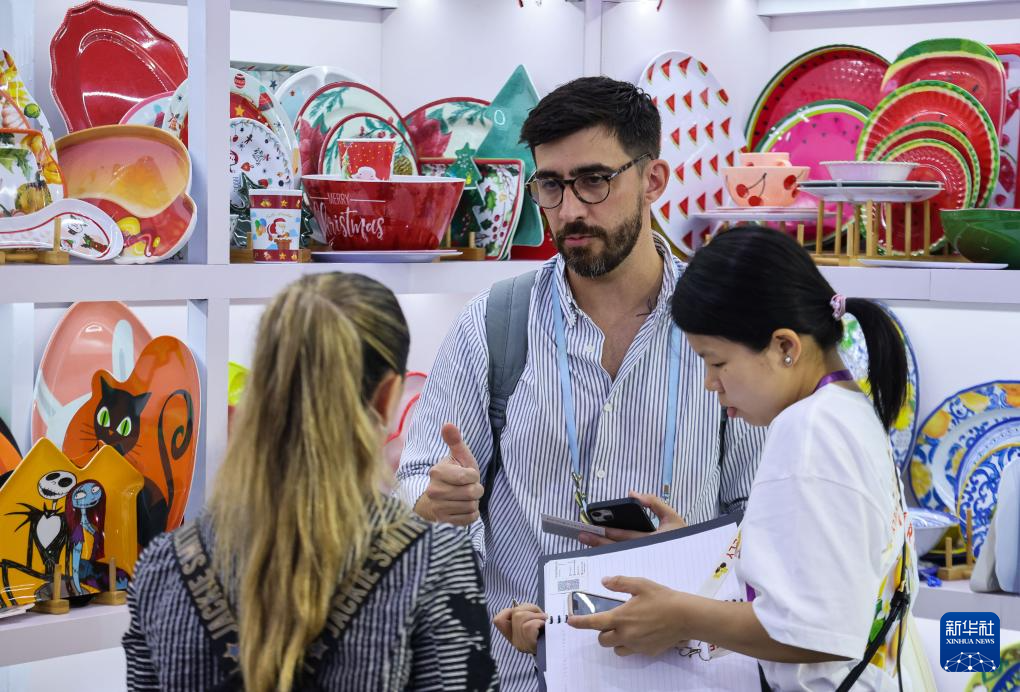 来自阿根廷的采购商(左一、左二)在第135届广交会上洽谈(4月24日摄)。