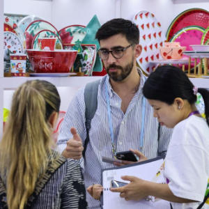 境外采购商在第135届广交会上交流(4月15日摄)。