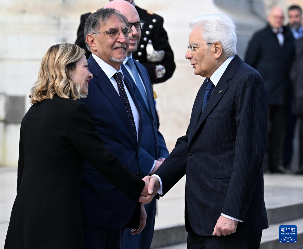 4月25日,在意大利罗马,意大利总统马塔雷拉(前右)与总理梅洛尼(前左)出席纪念活动时握手。