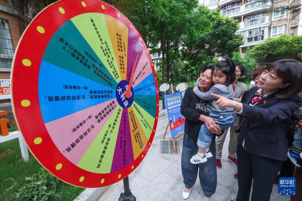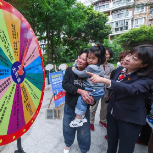 4月25日,在长兴县雉城街道所前社区,长兴农商银行城东支行的工作人员带领居民参与反诈防诈知识大转盘游戏。