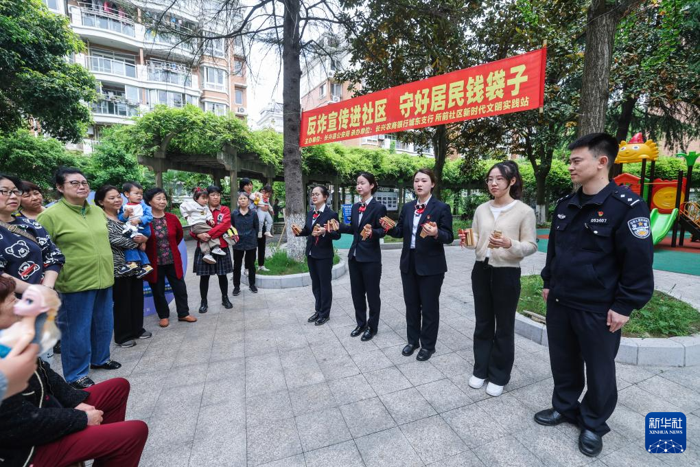 4月25日,在长兴县雉城街道所前社区,长兴农商银行城东支行的工作人员和所前社区的党员志愿者正在表演反诈快板,宣传反诈知识。