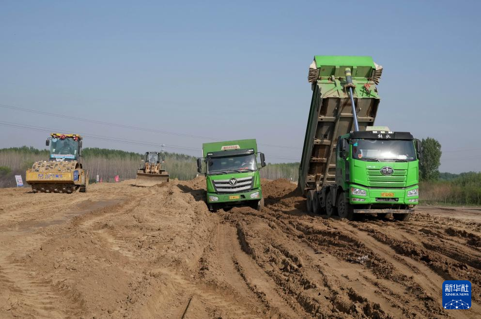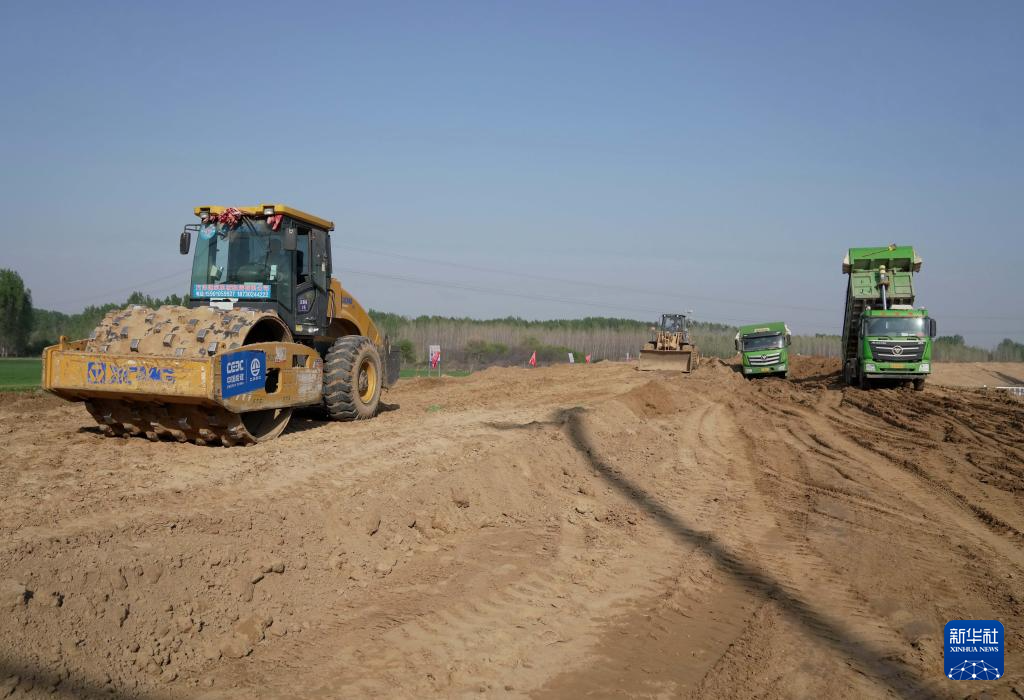 4月24日,在河北省涿州市北拒马河涿州段应急防洪治理工程建设工地,工人操作工程机械设备施工。