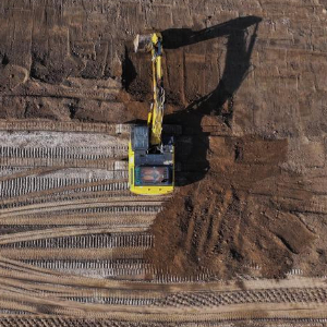 4月24日,工人在河北省涿州市北拒马河涿州段应急防洪治理工程建设工地操作工程机械设备施工(无人机照片)。