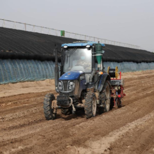 4月25日,在阜新市阜新蒙古族自治县于寺镇官营子村,村民驾驶玉米播种机在两座大棚中间的土地上种玉米。